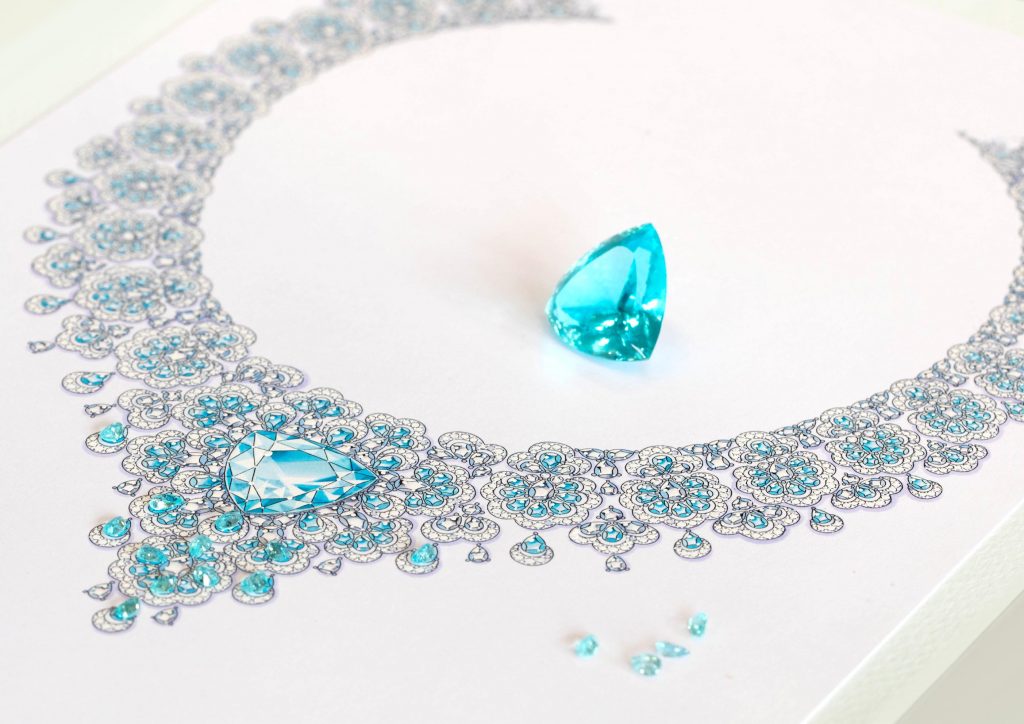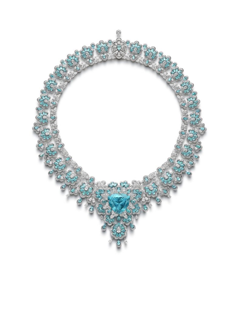 O brilho do azul-oceano da turmalina Paraíba Caroline Scheufele introduz um novo colar de diamantes e turmalina Paraíba da coleção Precious Lace. Através de um esplêndido efeito que se assemelha à renda, esta peça de joalharia evoca o trabalho de filigrana luminosa ao mesmo tempo que incorpora um mineral raro e um design único.