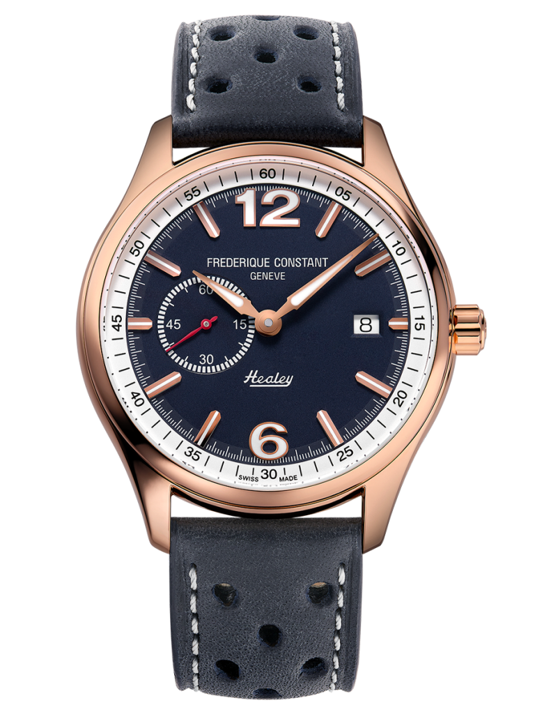 Finalmente, a última versão pretende ser a mais clássica, alinhada com a relojoaria de luxo de Genebra que a Frederique Constant sempre defendeu. A caixa é banhada em ouro rosa, assim como os índices, os ponteiros e a coroa. Com o tom do ouro rosa destaca-se o azul noturno do mostrador, também reproduzido na correia em pele. De dia ou de noite, este último Vintage Rally Healey Automatic Small Seconds irá brilhar com classe e elegância.