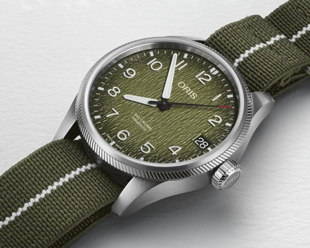 O novo relógio é inspirado no Oris Big Crown ProPilot. O seu mostrador verde remete-nos para a vegetação do Delta do Okavango, replicando os seus exuberantes prados, e a correia exclusiva em tecido verde é criada pela Erika’s Originals.