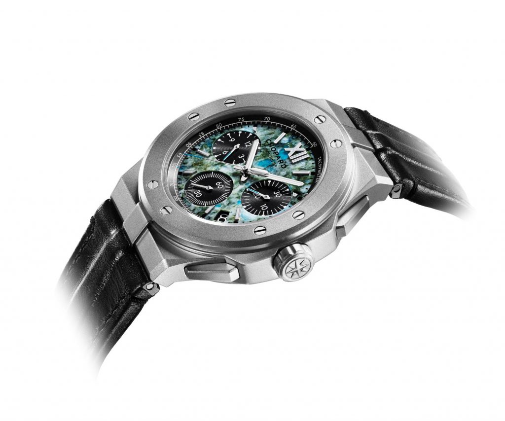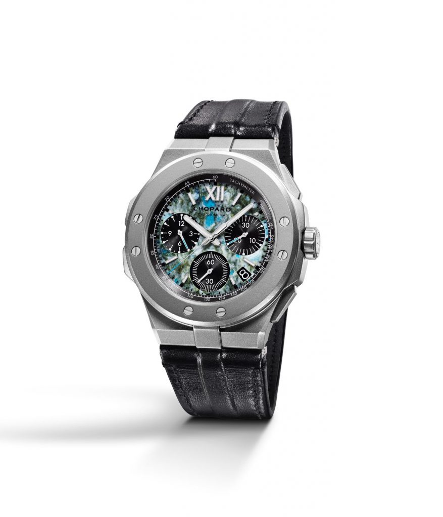 o Alpine Eagle XL Chrono Only Watch, distingue-se pelo mostrador em granito suíço da região de Graubünden com tons de azul e verde, que relembram as cores dos alpes suíços vistos do céu.