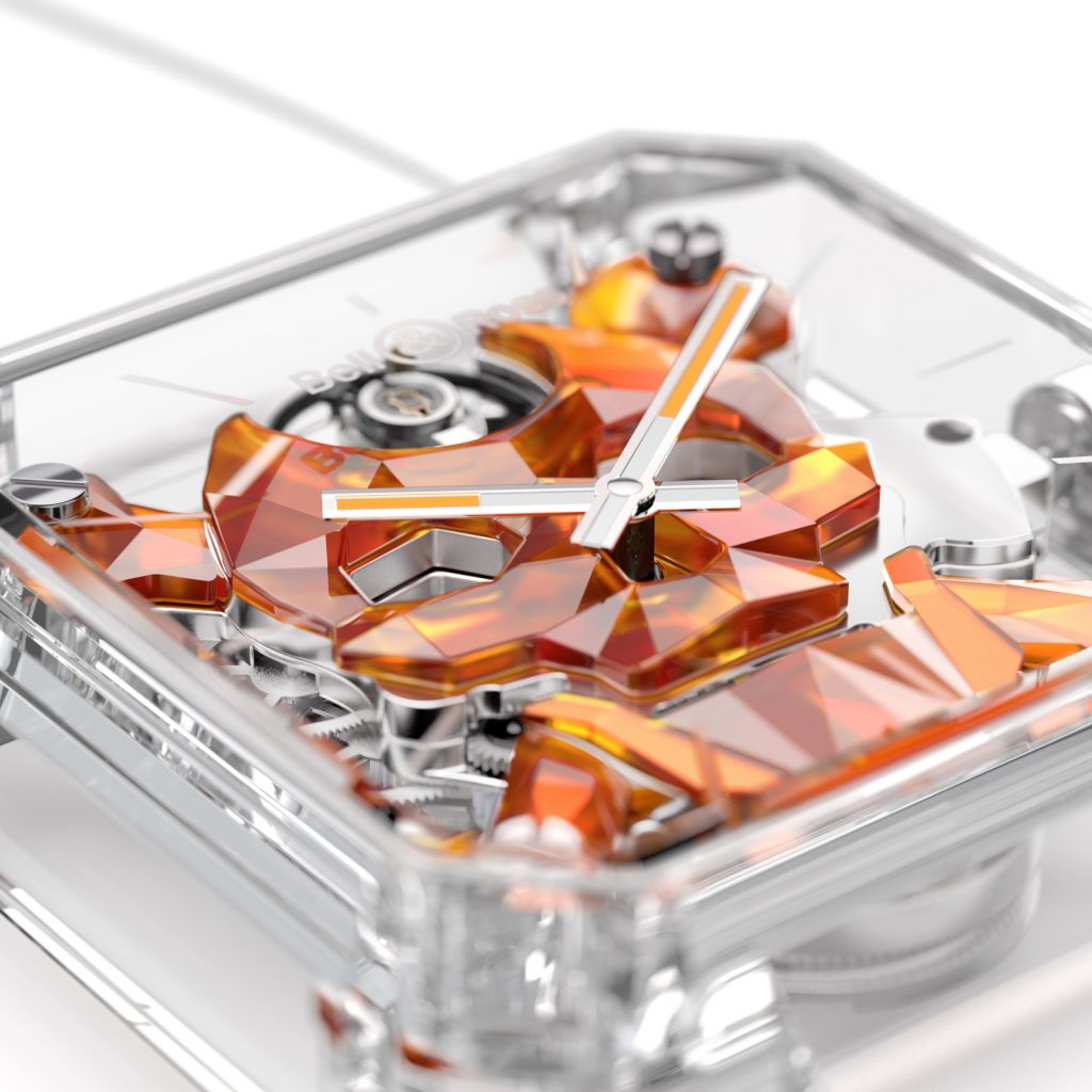 Nesta versão personalizada do CYBER SKULL, a Bell & Ross optou pela cor laranja “para conferir uma personalização única quando usado no pulso”. O laranja é também a cor usada no logotipo Only Watch. Em safira transparente, o mostrador Skull é metalizado no verso. No verso do relógio encontra-se uma gravação especial dedicada ao Only Watch.