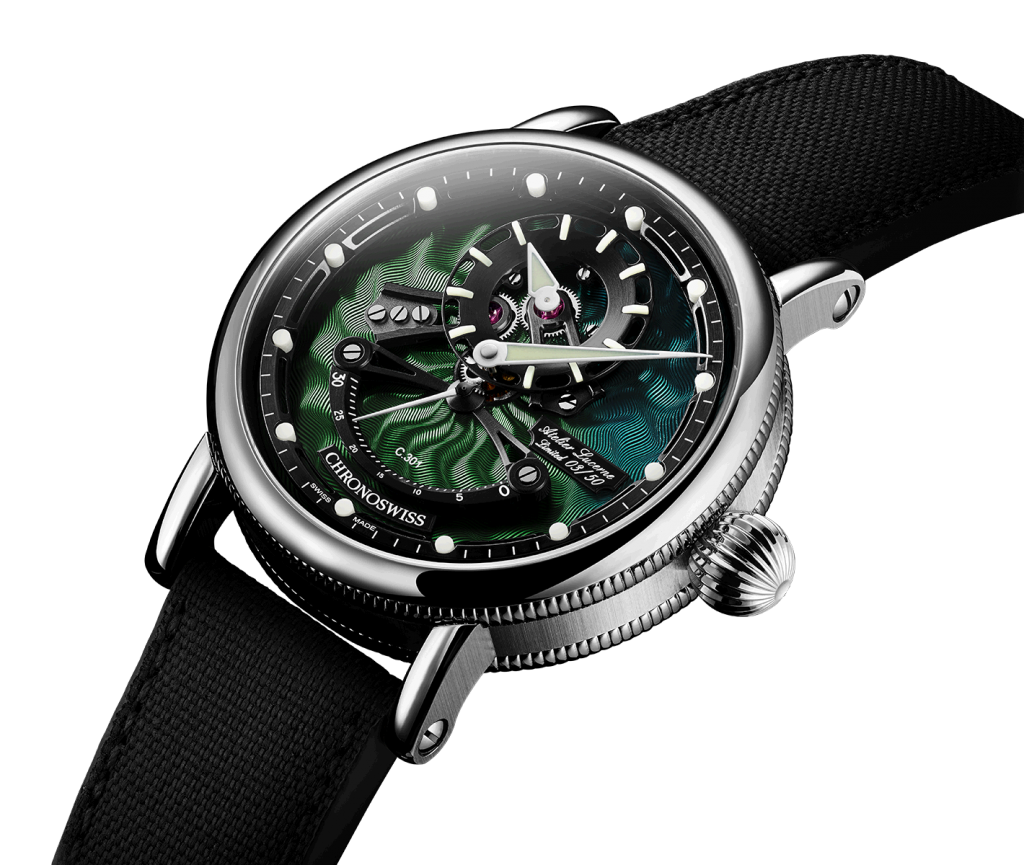 “The undulating moiré pattern on this watch is inspired by the blue hour in a tropical jungle, with its vivid colours changing from lush green to silvery blue and sombre black,” says Chronoswiss owner and director Oliver Ebstein.
