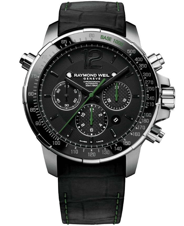 Os pormenores de verde, vermelho, amarelo e cinza adicionam personalidade desportiva a esta coleção. A alta tecnologia suíça está incorporada neste relógio nesta coleção assinatura da Raymond Weil, um produto que realmente transmite e mostra a capacidade da marca suíça de criar obras-primas da relojoaria.