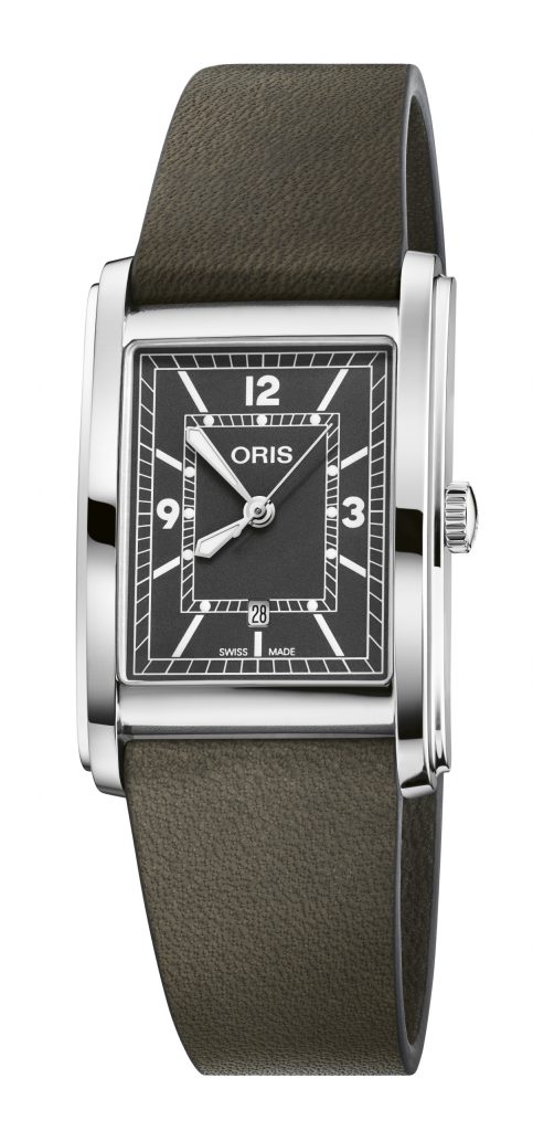 Disponíveis com mostrador branco, azul, verde e bordeaux com um design fortemente influenciado pelo estilo Art Déco, os novos modelos Oris Rectangular destacam-se pelos níveis nos flancos da caixa que amplificam a sua presença, e o afunilamento asas que, ao mesmo tempo, garantem que assenta naturalmente no pulso. Os frisos percorrem tanto a borda exterior do mostrador como um retângulo interior que reflete e complementa a silhueta da caixa. Os índices às 12, 9 e 3 horas jogam com simetria e assimetria, enquanto os ponteiros em forma de espada e uma janela com data às 6 horas completam a disposição.