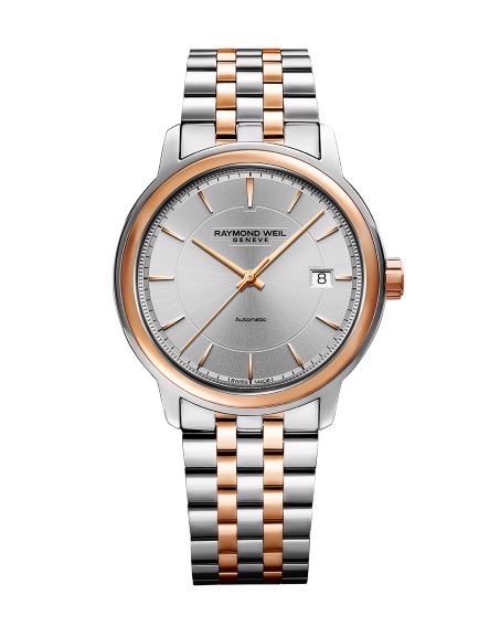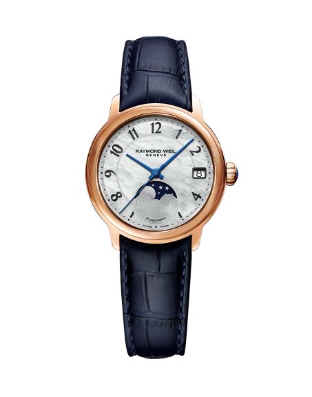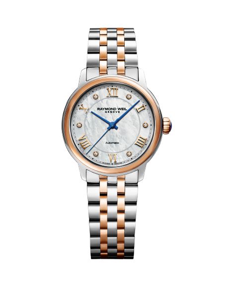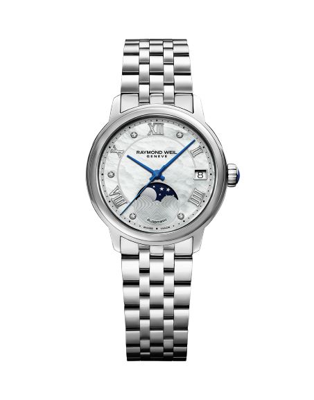 As referências Maestro, todas com movimentos automáticos, trabalham a autenticidade e expertise da marca em estilos elegantes. Nesta linha Raymond Weil destaca-se pelas suas peças femininas com fases da lua, e masculinas com janela para o movimento do relógio. Nas peças femininas, temos acesso a mostradores delicados de 33mm de diâmetro, com madrepérola e índices com algarismos romanos ou árabes.