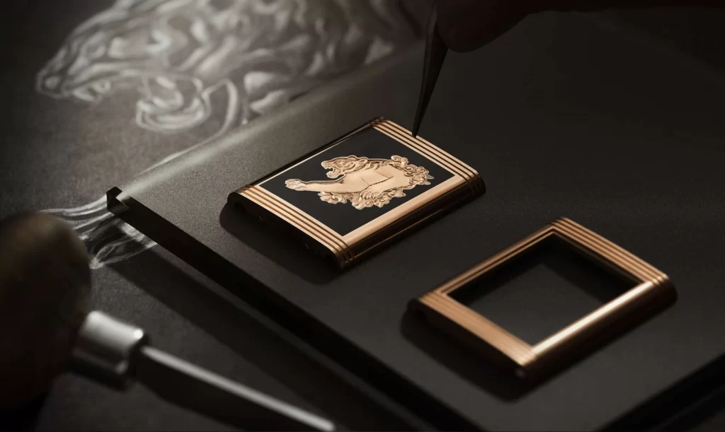 Girar a caixa do relógio para o verso revela um magnífico tigre. Gravado no metal da caixa em ouro rosa, parece saltar de seu fundo de esmalte preto opaco Grand Feu, a superfície polida da pelagem do tigre e a textura contrastante de suas listras capturando e refratando a luz para criar a ilusão de movimento e poder.