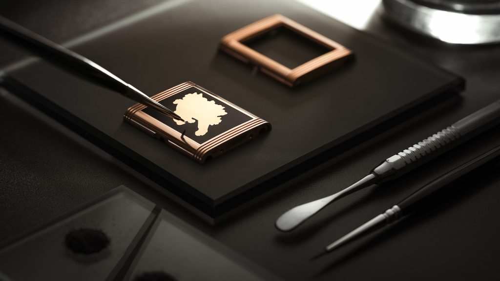 O mostrador do Reverso Tribute Enamel “Tiger” apresenta o esmalte preto opaco grand feu, replicado no fundo da caixa. A simplicidade elegante do mostrador Reverso Tribute, com seus marcadores de horas aplicados facetados, faixa de minutos chemin de fer e ponteiros Dauphine – neste caso, perfeitamente combinados com o ouro rosa da caixa – valoriza totalmente a beleza sutil do fundo preto brilhante.