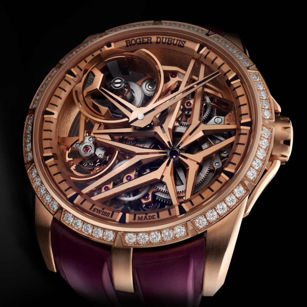 O novo Monobalancier Excalibur em EON GOLD é revestido com 60 diamantes, numa caixa de 42 mm, disponível com uma pulseira de couro roxa estampada e com uma pulseira de pele em relevo preta. O micro-rotor da Excalibur Monobalancier foi agora otimizado para minimizar as vibrações, numa peça única gravada com o monograma Roger Dubuis.