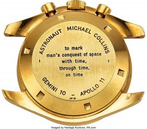 A description that certainly applies to Apollo 11 command module pilot Michael Collins, who received the Speedmaster #19 – the watch is now in the possession of a passionate collector. More than just the basic value of this Speedmaster, what adds value is the custom-engraved back of the watch, featuring the astronaut’s name, his missions – and a poetic tribute to the spirit of space exploration.