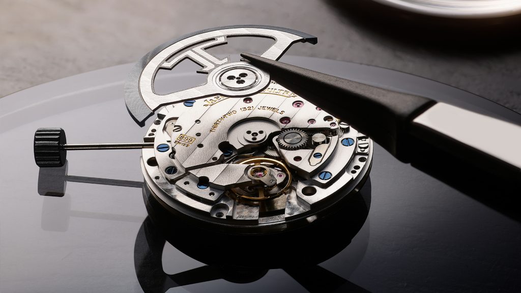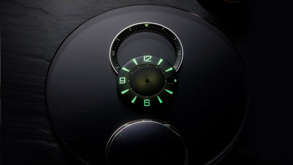 O sistema de troca rápida da bracelete em cauchu verde garante máxima versatilidade de utilização: no espaço de poucos segundos, a bracelete pode ser facilmente trocada por uma das numerosas variedades de braceletes Jaeger-LeCoultre perfeitamente compatíveis.
