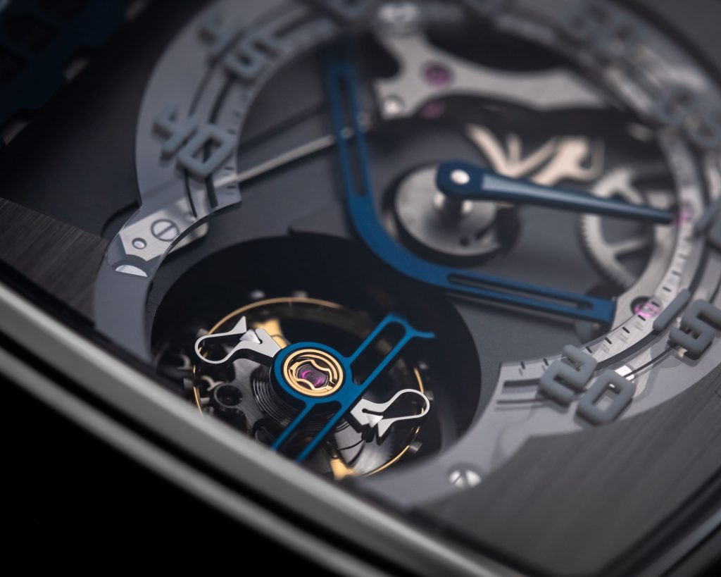 O calibre D50 com movimento de corda automática é o motor que guia o modelo Linear Series 1, que contém 239 componentes e oscila a uma frequência de 3 Htz oferecendo reserva de energia até 72 horas.