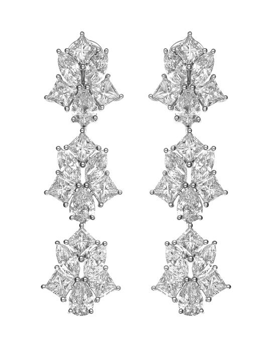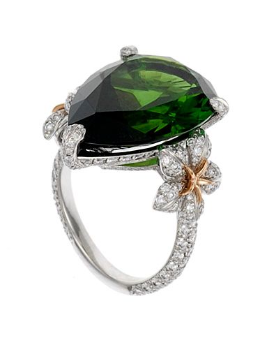 As joias, combinam com um anel verde de 16,99 quilates em pear-shape e diamantes, adornados em ouro branco e rosa de 18 quilates, ambos da coleção Haute Joaillerie.