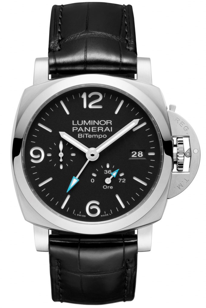 O Luminor BiTempo foi interpretado em duas paletes de cores distintas, cada uma com uma presença convincente e segura, criadas com base na caixa em aço de 44mm. O primeiro é centrado num mostrador azul vibrante escovado com uma pulseira de crocodilo no mesmo tom rico (PAM01361); o segundo tem um mostrador preto fosco e uma pulseira de crocodilo a combinar (PAM01360). Em ambas as cores, o Luminor BiTempo possui uma função GMT que indica a hora num segundo fuso horário com um ponteiro azul ciano vívido para garantir a visibilidade num relance.