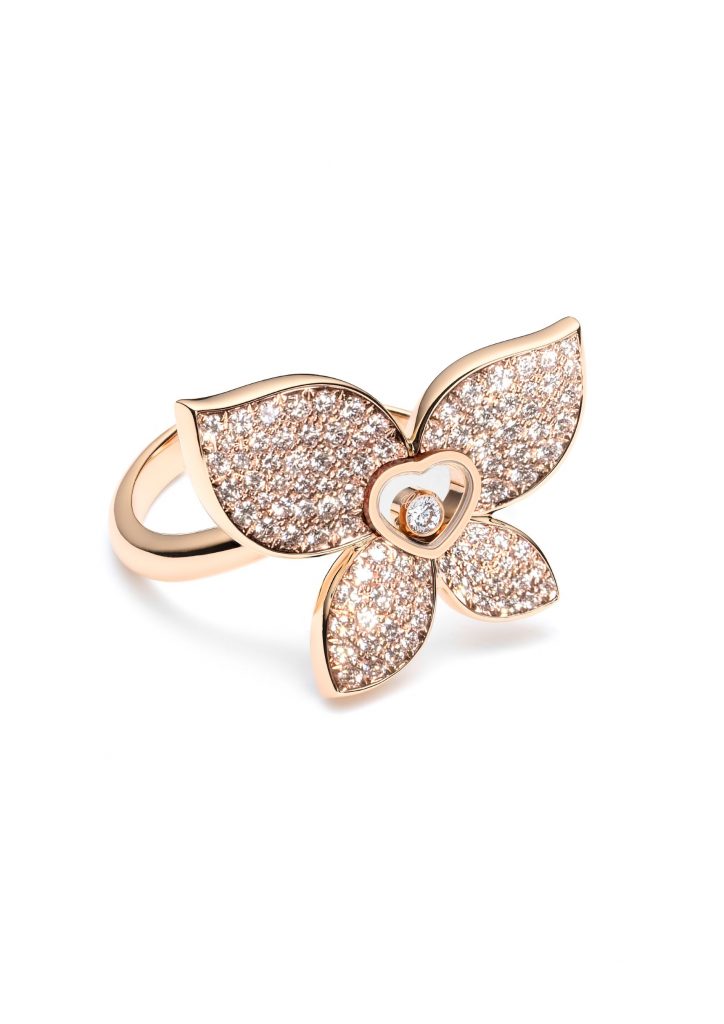 A coleção Happy Butterfly x Mariah Carey preserva os códigos de assinatura da linha Happy Diamonds da Chopard, agora transformados em borboletas. Composta por diamantes ou cornalina, as asas da coleção dão movimento a estas criações através da sua assimetria.