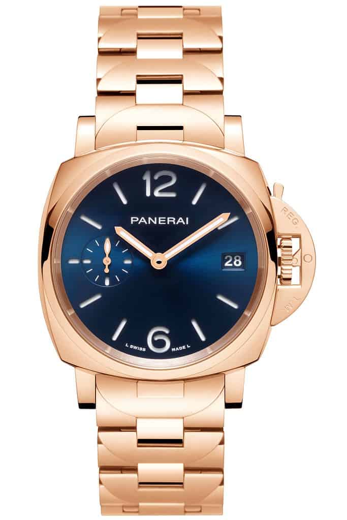 O Luminor Due TuttoOro apresenta um mostrador sandwich escovado, uma textura subtil à superfície que reflete a luz ao longo de sua extensão com o menor dos movimentos e exibe minutos, horas, pequeno ponteiro dos segundos e a data. Vem disponível em duas cores, branco e azul marinho profundo, sendo que este último será vendido exclusivamente em boutiques Panerai.