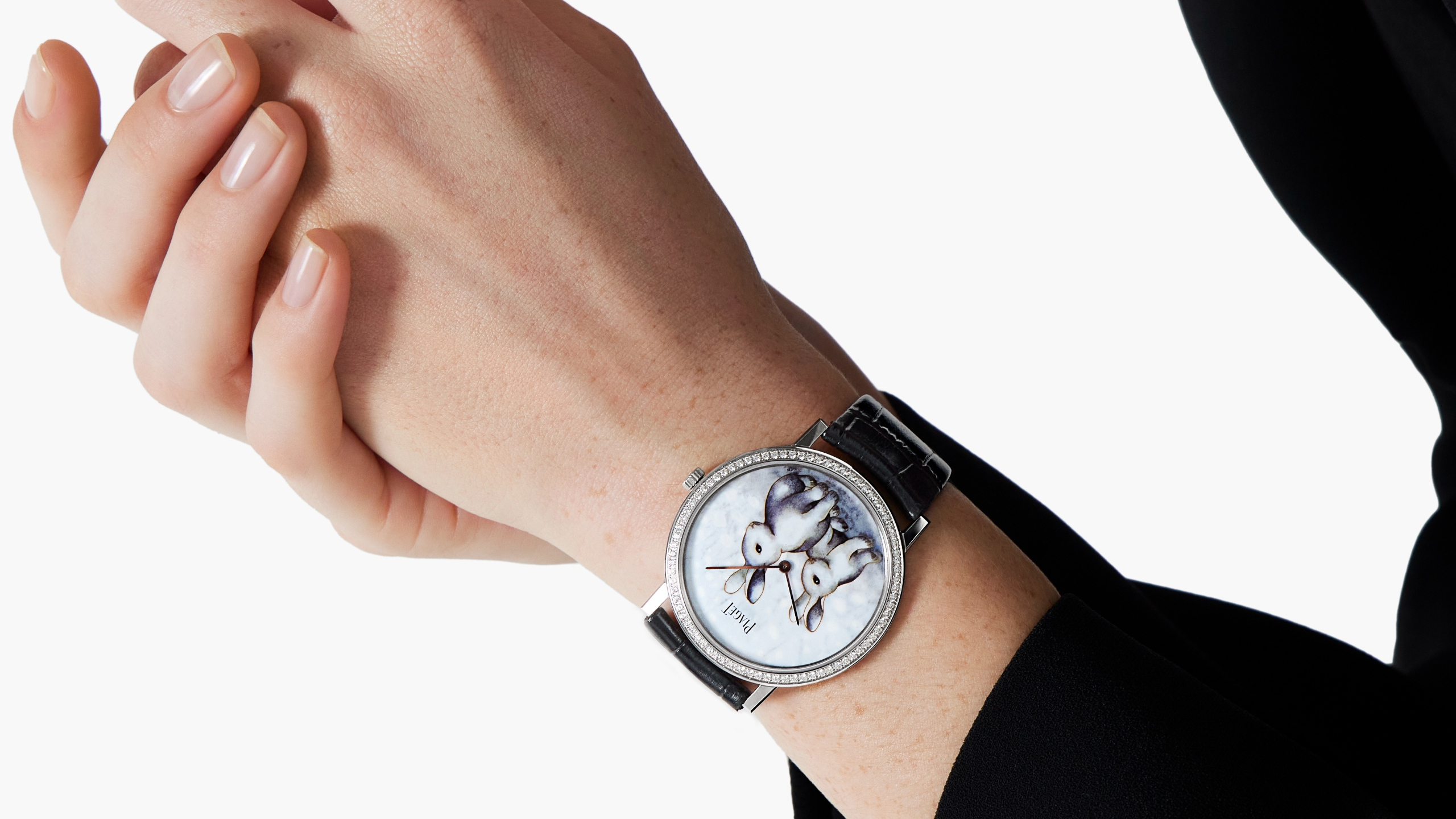 Created by the enameller Anita Porchet (who has worked with Piaget since 2006) and featuring her flawless craftsmanship, these 38 limited-edition Altiplano pieces depict two luminous rabbits, encased in a 38mm, 18 carat white gold box, set with 78 brilliant-cut diamonds. Propelled by the homemade, ultra-thin 430p hand-wound movement, the exclusive Altiplano is mounted on a black alligator skin leather strap.