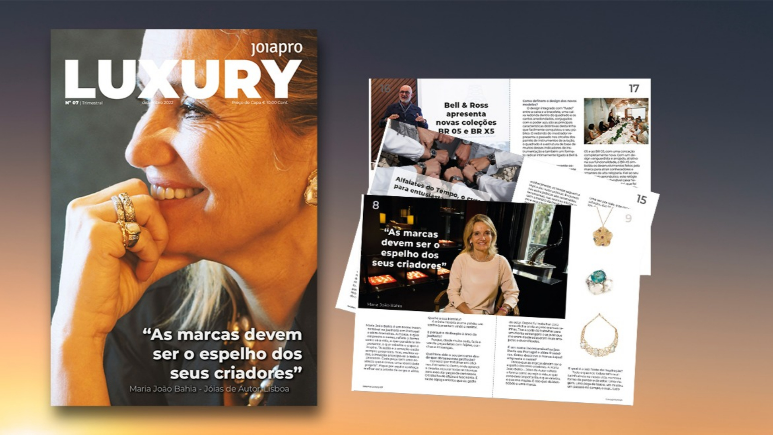 Maria João Bahia, um nome incontornável da alta joalharia em Portugale além-fronteiras, dá cor à capa desta sua JoiaPro LUXURY. A marca, à qual empresta o nome, reflete a forma como vê a vida, o que consideraimportante, o que valoriza e oque a inspira. “A razão e a emoçãoestão sempre presentes, mas, muitas vezes, a intuição antecipa-se atodo o processo. Cada peça tem uma essência que é única, umaidentidade própria”.