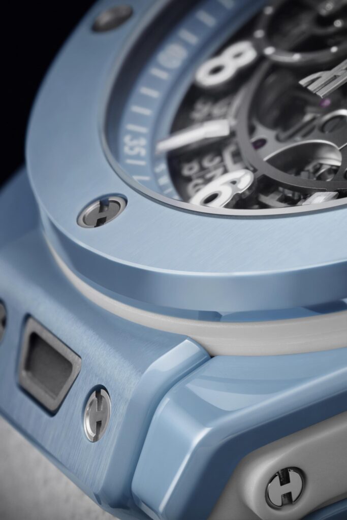 O mostrador, como um céu sem nuvens, revela a roda de colunas do calibre de manufatura HUB1280, um movimento cronógrafo de corda automática com uma reserva de marcha de 72 horas. Enquanto o seu movimento de manufatura Unico segue suavemente a passagem fácil do tempo, o Big Bang Unico Sky Blue evoca uma sensação de luminosidade e intemporalidade. Os ponteiros e os índices brancos luminescentes, que parecem suspensos, marcam as horas passadas em alegres reuniões.