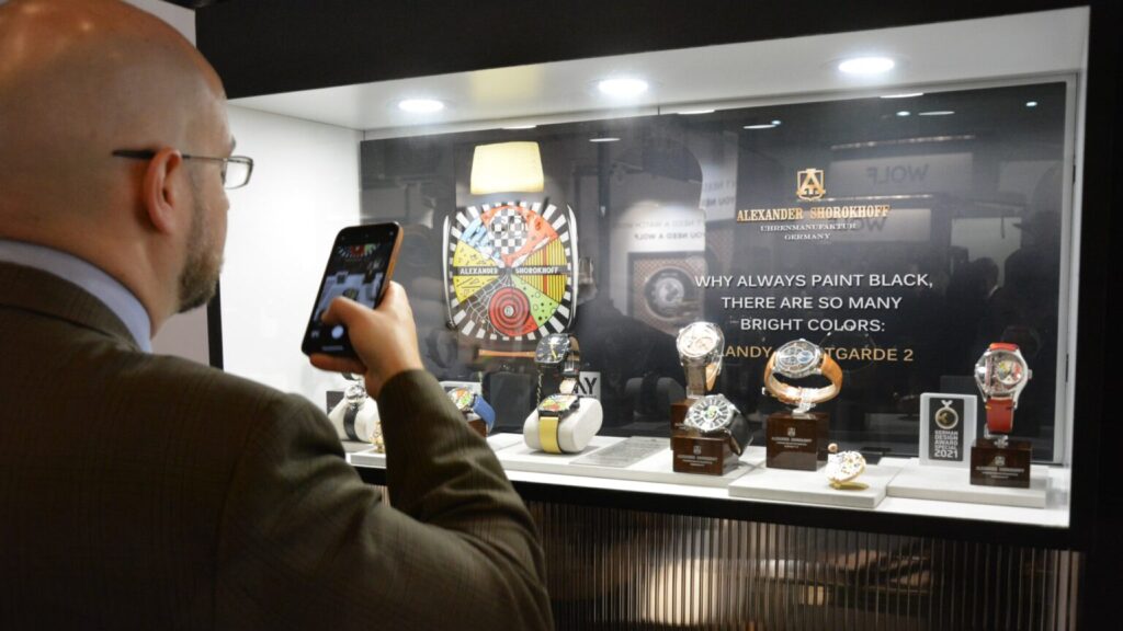 The phrase “Why always paint black when there are so many colours” gives the German exhibitor the motto to promote some of its novelties at the show. “Bold” models such as “Square & Round”, “Babylonian III”, “Swan Lake”, “Levels” and, last but not least, with the “Kandy Avantgarde 2”, are its creative exponent in the mechanical precision watch market.