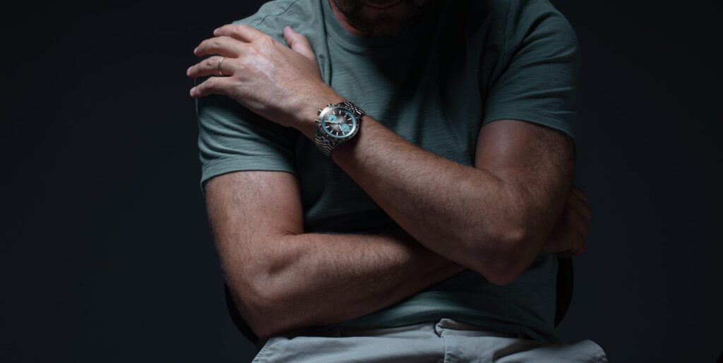 O mostrador preto gradiente serve como a tela perfeita para os detalhes turquesa dos contadores do cronógrafo e do pulsómetro, proporcionando um cativante toque de cor no pulso. A disposição simétrica Bi-Compax apresenta um contador de cronógrafo de 30 minutos e pequenos segundos, enquanto os ponteiros de horas e minutos de proporções generosas, complementados com índices niquelados realçados com Super-Luminova® branco, asseguram uma ótima legibilidade. Posicionado às 6 horas, uma janela de data contribui para a simetria geral do mostrador. A bracelete de titânio com cinco fileiras completa a construção leve e ergonômica do relógio.