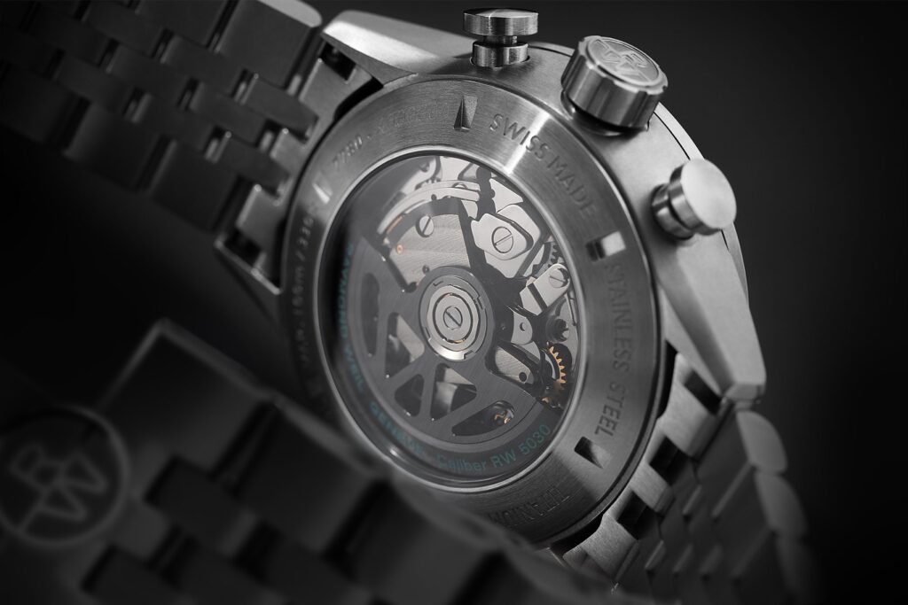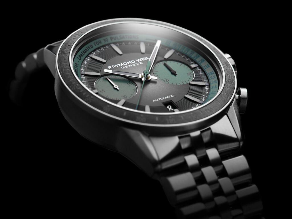A caixa de titânio de 43,5mm com uma luneta com escala taquimétrica em cerâmica preta apresenta todas as características de um cronógrafo Raymond Weil; movimento automático RW5030, reserva de marcha de 56 horas e monograma e efeito canelado na coroa.