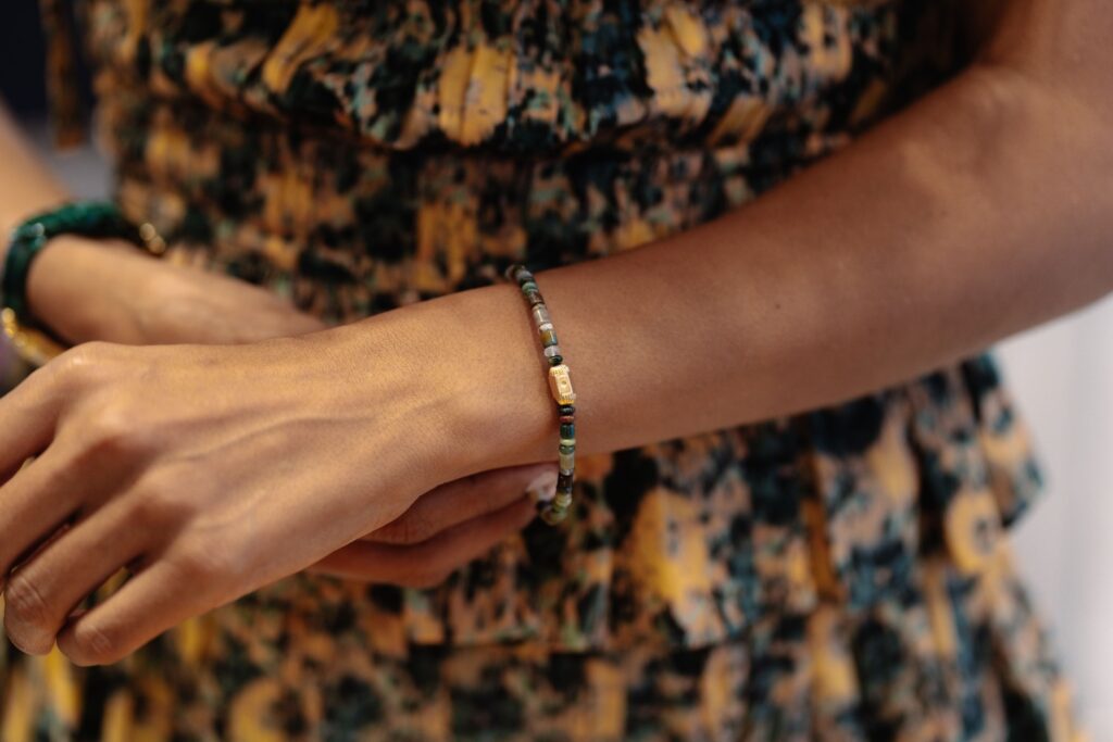 As missangas utilizadas podem ser de vidro, pedras preciosas ou semipreciosas. Além disso, refletindo a preocupação e cuidado com o meio ambiente, a marca já incorporou materiais reciclados na criação das suas peças, como borracha e discos de vinil.
