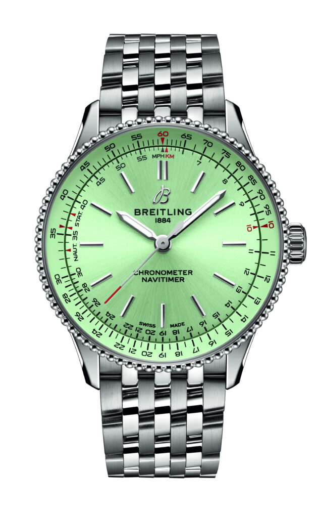 O Navitimer de 36mm apresenta o bisel de contas e a emblemática régua de cálculo circular (utilizada pelos pilotos como calculadora analógica), conferindo ao Navitimer o seu visual inconfundível. Este modelo está disponível num trio de mostradores de cores metálicas elegantes (verde menta, prateado e antracite), com índices em forma de bastão, ou num mostrador em madrepérola branca engastado com “diamantes melhores” de corte redondo. Enquanto parte da “mission to do better” da Breitling, estes diamantes são produzidos em laboratório e rastreáveis até produtores certificados que cumprem a norma de sustentabilidade SCS-007 Sustainability Rated Diamonds. Da mesma forma, a versão totalmente em ouro é composta por “ouro melhor”, rastreável até minas artesanais e de pequena escala que cumprem os critérios da Swiss Better Gold Association em matéria de impacto social e ambiental. O Navitimer 36 é movido pelo Calibre Breitling 17, certificado pelo COSC — um movimento de corda automática com três ponteiros.