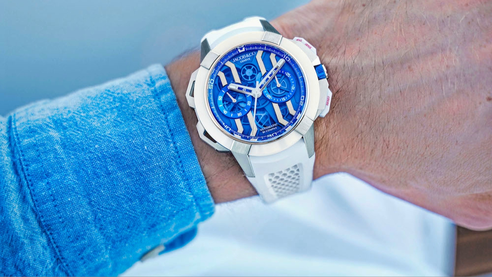 O relógio Jacob & Co. Epic X Chrono 44m foi criado com uma luneta interior rotativa que pode ser controlada empurrando e rodando uma coroa de borracha na posição das dez horas, o que irá definir um temporizador de contagem decrescente.