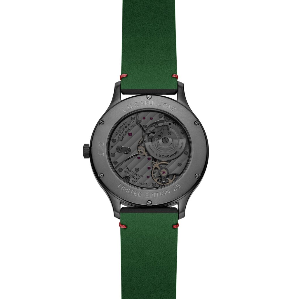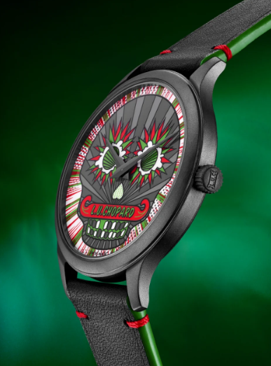 Esta edição limitada de 25 peças mostra no seu centro uma calavera mexicana vívida, inspirada na pop art, o símbolo associado ao festival anual Día de los Muertos, apresentada em brilhantes flashes de cor e rodeada por uma caixa de 40mm em Lucent SteelTM preta jateada com revestimento DLC. O relógio é alimentado pelo LUC 96.53-L, um calibre automático primorosamente acabado à mão, concebido e fabricado nas oficinas da Chopard Manufacture.