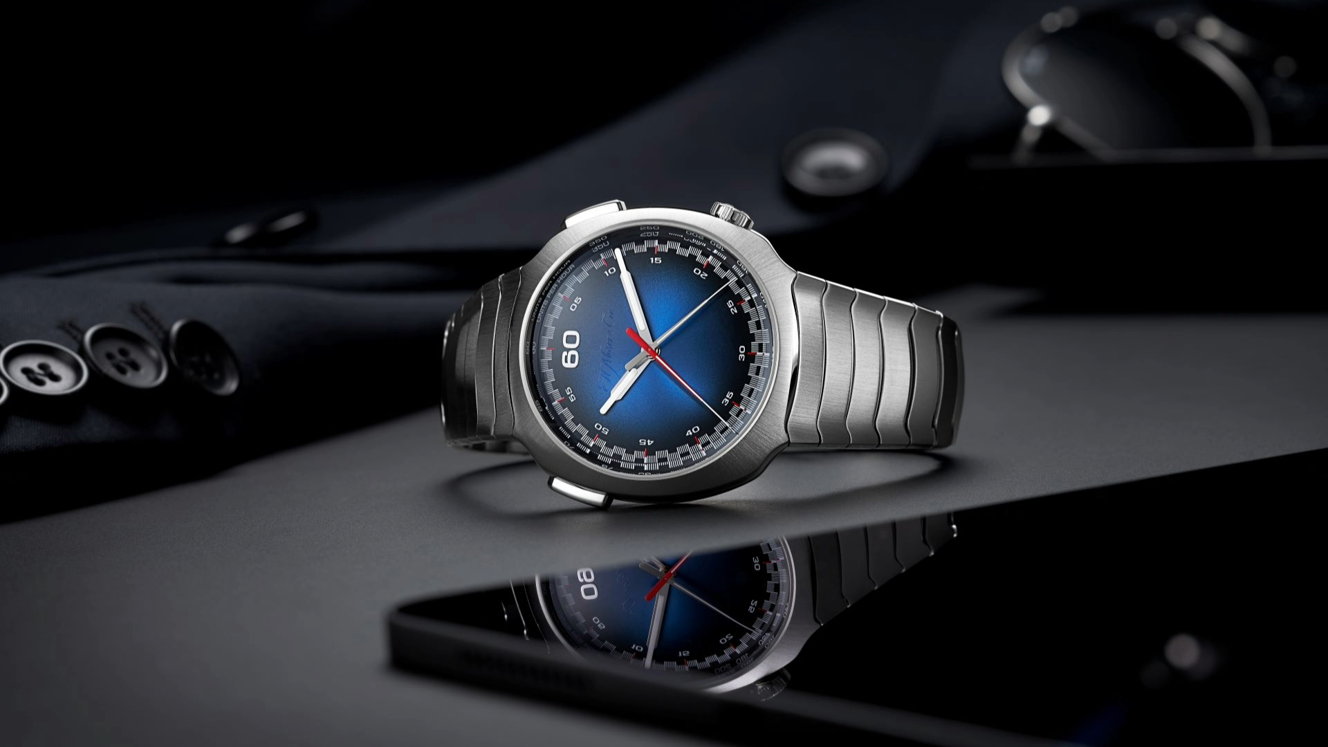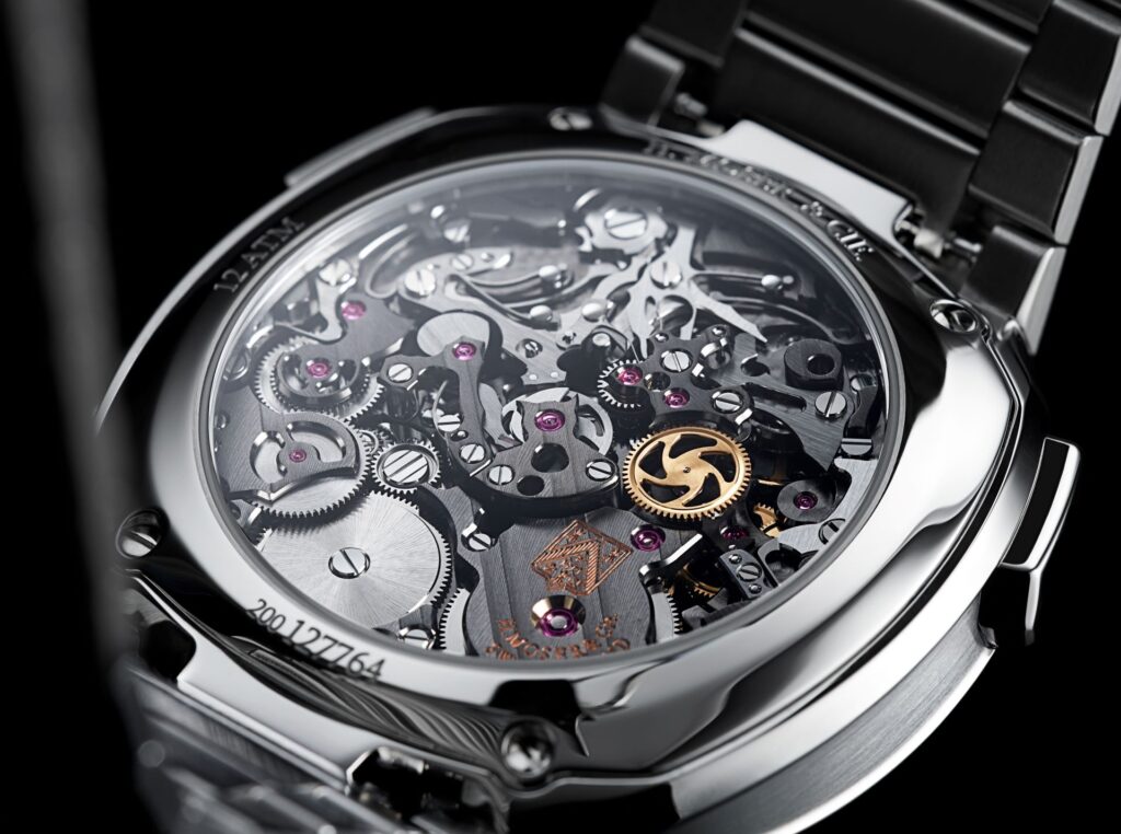 Do lado do movimento, este cronógrafo automático com mostrador central e função flyback nos minutos e segundos, foi desenvolvido pela AGENHOR, uma das empresas parceiras da H. Moser & Cie., com foco no minimalismo e na legibilidade. Visível através do fundo da caixa em safira, o calibre HMC 907 apresenta um acabamento altamente contemporâneo, com as tradicionais listras Moser em ângulo de 45° e banho de ródio cinza antracite nas pontes e na placa principal. O peso oscilante foi colocado entre o movimento e o mostrador para permitir que o funcionamento do cronógrafo e a sua roda de colunas sejam admirados.