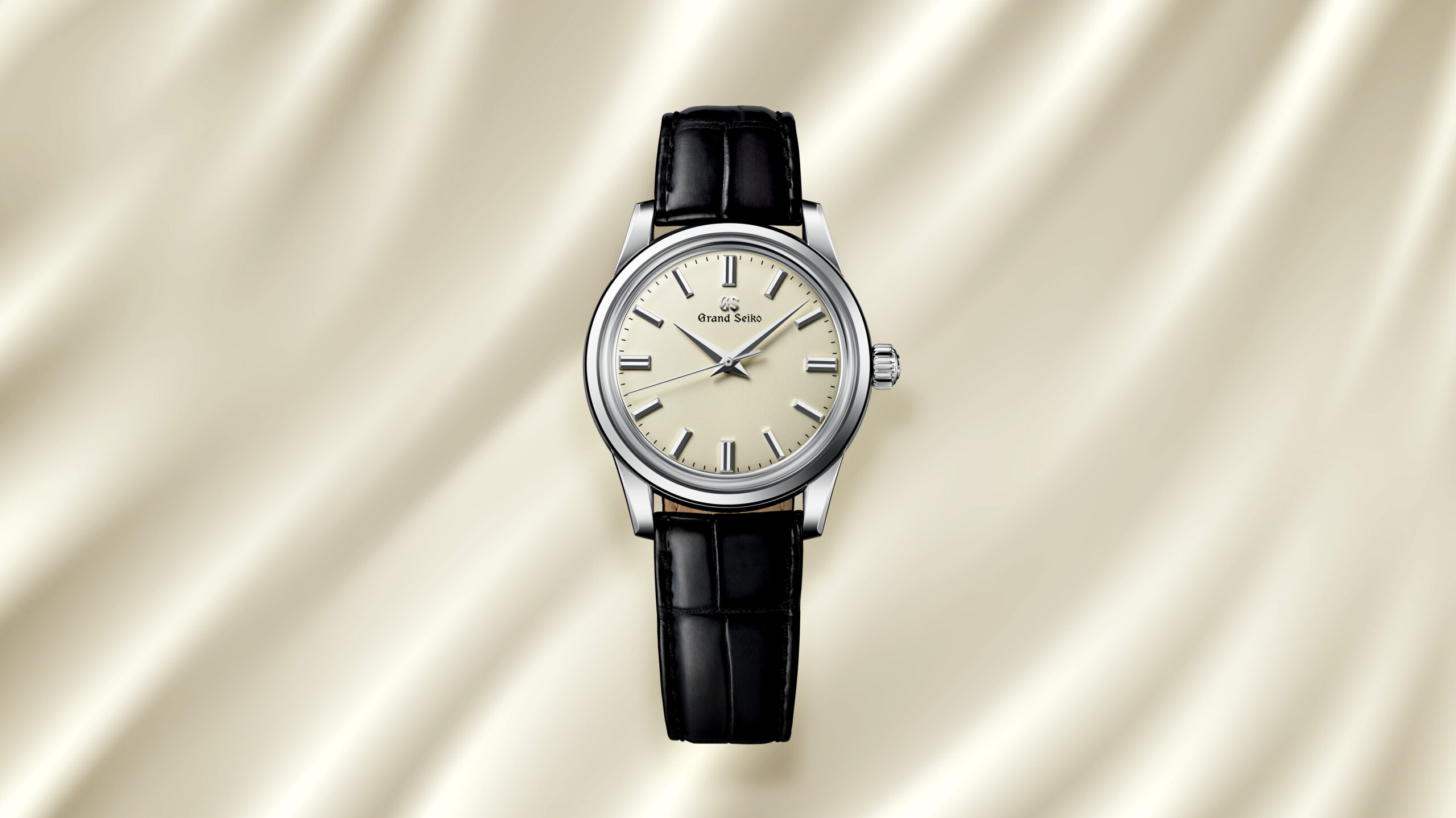O relógio apresenta um mostrador em marfim mate de sofisticada essencialidade e pureza, onde se destaca o logotipo Grand Seiko.