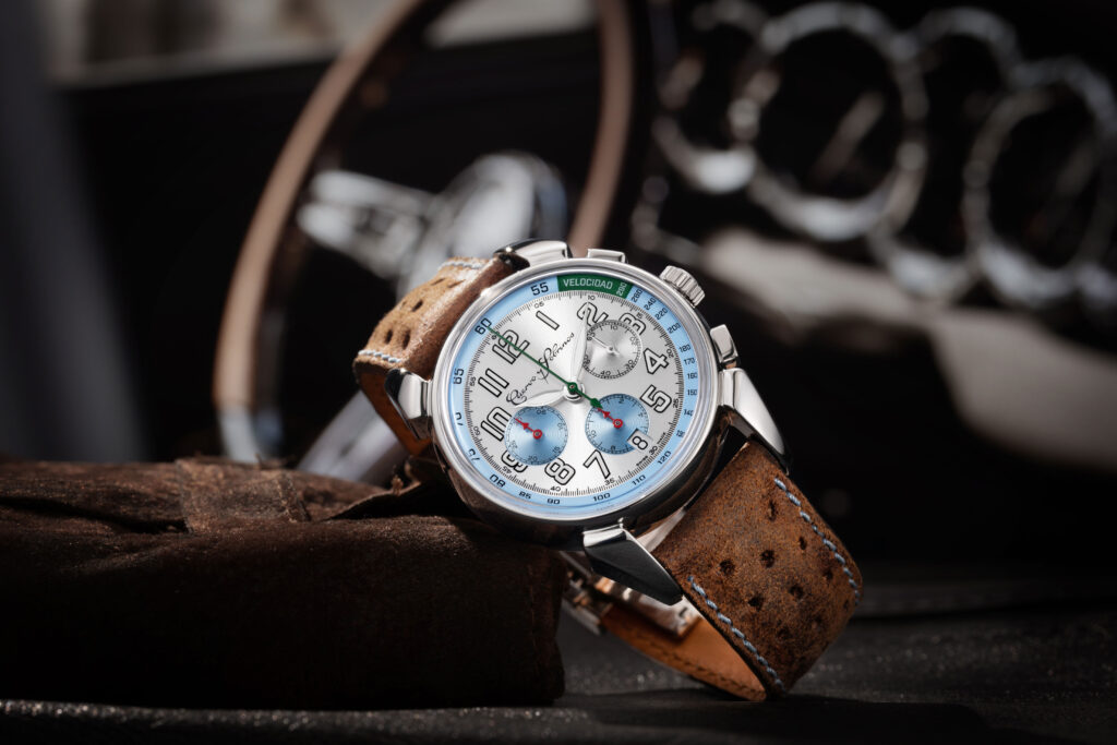 O relógio vem com uma bracelete “estilo racing” em pele – castanho mate com pesponto azul claro e apresenta perfurações, um pormenor inspirado nas luvas de corrida de outrora. O fundo da caixa é adornado com uma dedicatória ao campeão mundial (“Primero Campeon Mundial” – o primeiro campeão mundial) e sua assinatura.