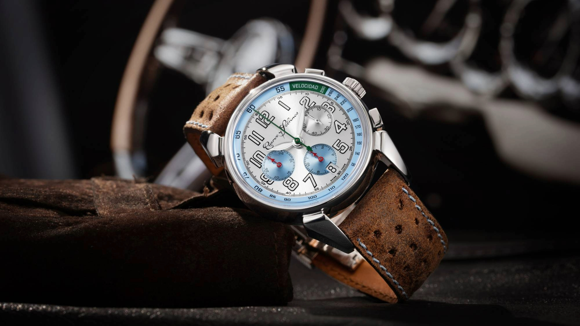 A equipa da Cuervo y Sobrinos quis adicionar algumas nuances à série anterior, alterando as cores e reduzindo o tamanho da caixa para um uso ainda mais desportivo sem sacrificar a elegância. O Cuervo y Sobrinos Historiador Nino Farina II está agora numa caixa de 40mm em aço. O mostrador fica sob um vidro de safira com tratamento antirreflexo.
