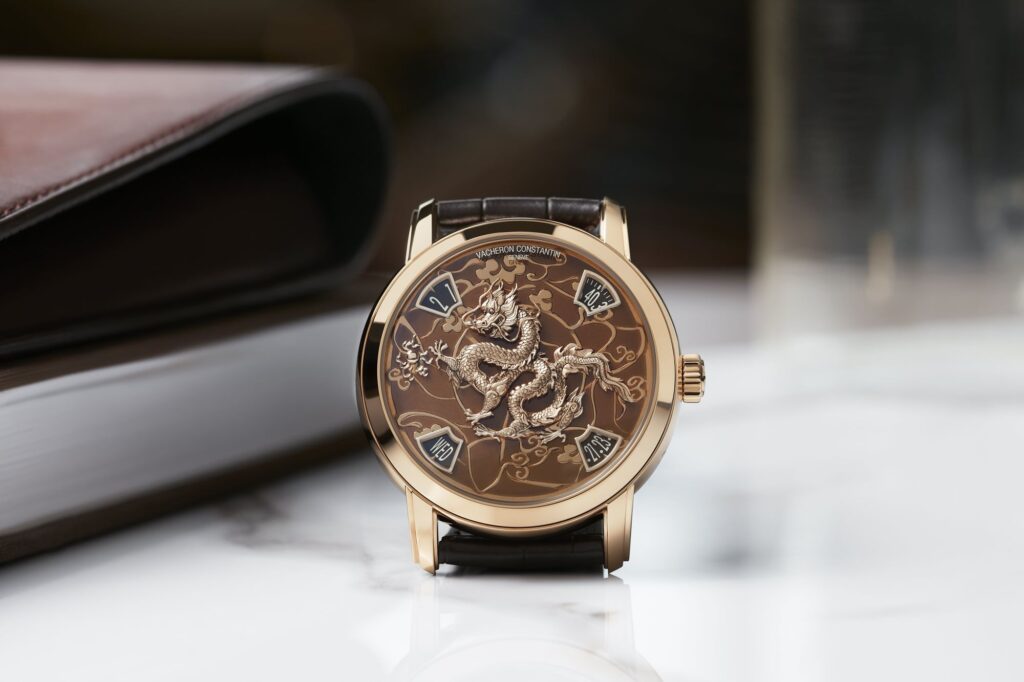 Personificação da honra, nobreza, sucesso e boa sorte, esta criatura sobrenatural também foi um poderoso símbolo do poder imperial chinês e, sem dúvida, ainda é o signo do zodíaco mais popular nesta cultura milenar. A sua silhueta esculpida semelhante à de uma serpente, ocupa o centro deste relógio, uma visão simbólica repleta de inúmeros detalhes que se destacam em relevo numa decoração delicadamente gravada e esmaltada. A obra de arte que daí resulta personifica uma fusão de força e delicadeza, nascida da união da gravura e do esmalte, duas artes raras cultivadas pela Vacheron Constantin.