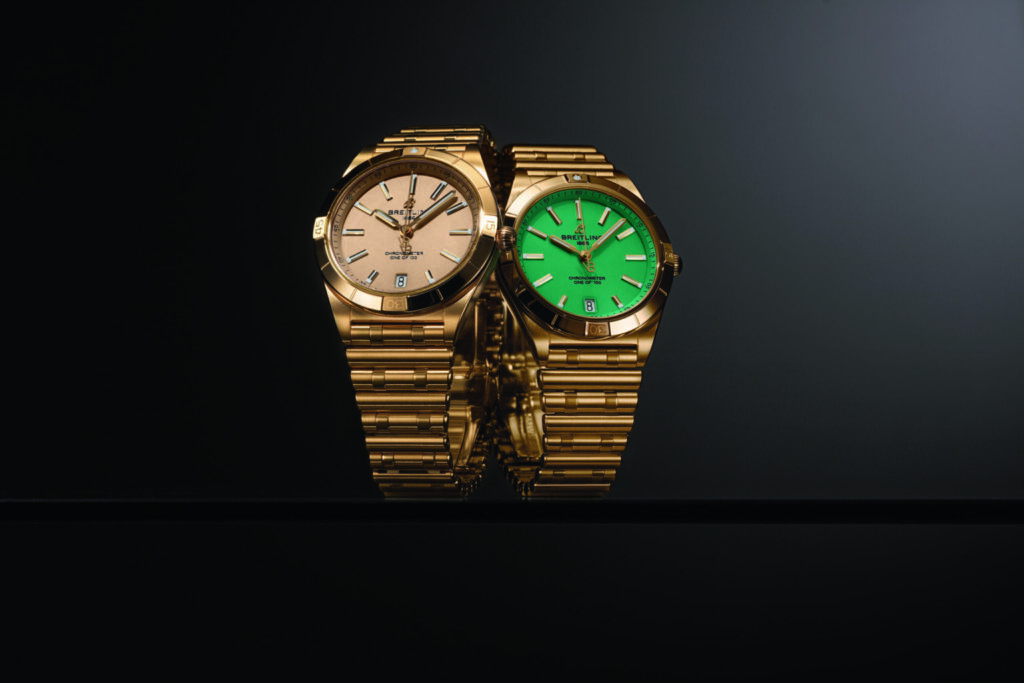 Moved by the Caliber Breitling 10, the Chronomat 36 Victoria Beckham collection preserves the classical characteristics of the Chronomat, like the Rouleaux watch strap in metal and the protruding mobile markers in the quarters of an hour, giving them a new dimension with new and different colors, inspired in the Beckham’s spring/summer 2024 pallet: mint, midnight blue, pigeon gray and sand.