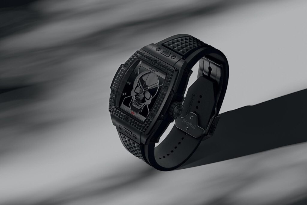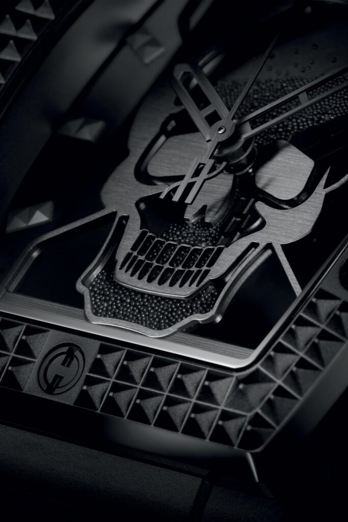 Criado em colaboração com o Depeche Mode, o design combina o motivo de caveira, um símbolo exibido no vídeo que anuncia o retorno da banda, com uma ampulheta para simbolizar a passagem do tempo. O centro do mostrador é preenchido com pequenas esferas de cerâmica preta que fluem simbolicamente para frente e para trás conforme o pulso se move, transmitindo o conceito de Memento Mori. Esta frase em latim, que significa “lembre-se de que você também vai morrer”, estimula a reflexão sobre a transitoriedade da vida. Ao lado do mostrador, as iniciais DM, logotipo da banda britânica, aparecem às 6 horas. Os índices assumem a forma de tachas em pirâmide, um motivo que ecoa no bisel de cerâmica preta.