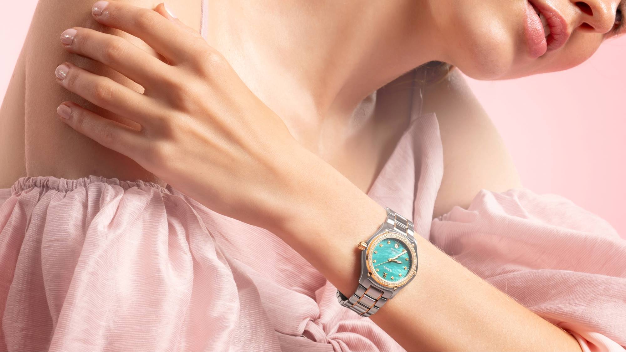 Apresenta um mostrador em madrepérola turquesa profunda com dez índices de diamantes radiantes, ainda mais realçados com a aura de 60 diamantes engastados em ouro de 18K. Inclui uma janela de data discretamente posicionada às 6 horas e um mostrador em vidro de safira antirreflexo para uma clareza impecável. É resistente à água até 10 bar.