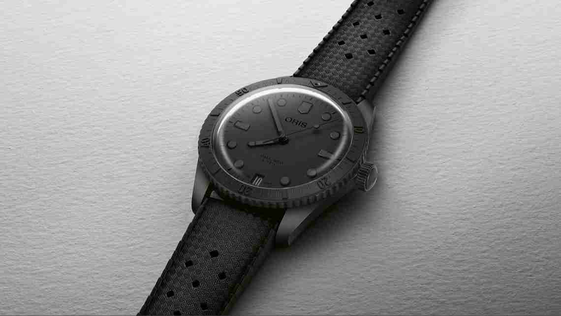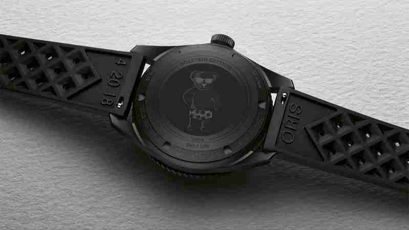 O acabamento preto sobre preto deste Divers Sixty-Five representa uma inovação para a marca, pois a caixa, a luneta e a coroa de 40 mm em aço inoxidável são todas revestidas em DLC preto. Os ponteiros, marcadores de horas, texto do mostrador, roda de data, lume e pulseira de borracha retro também são totalmente pretos. O fundo da caixa é revestido em DLC preto e gravado com um número de edição limitada e decorado com o Urso Oris.