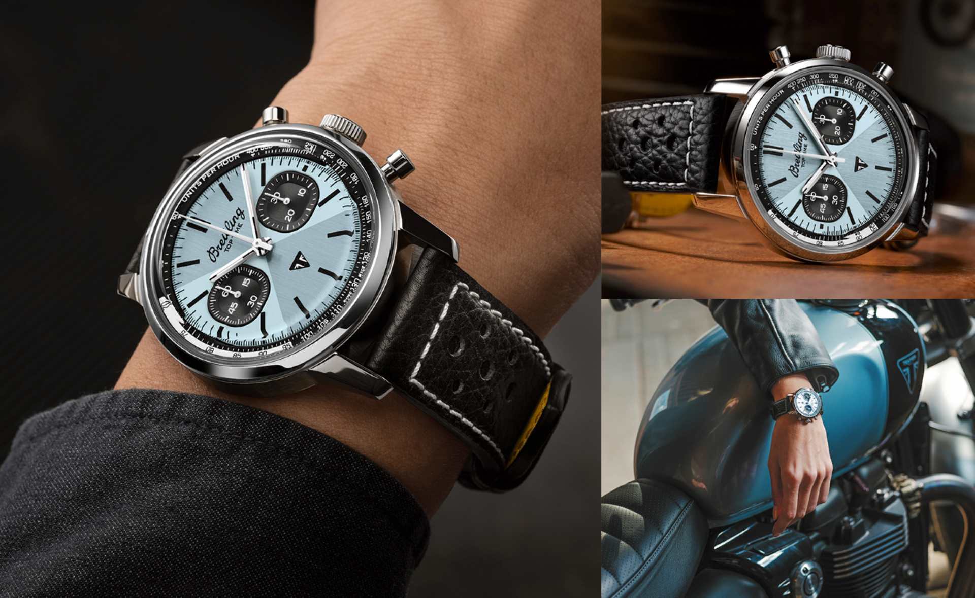 Os fãs dos cafés racers de inspiração vintage da Triumph também irão apreciar o Top Time Triumph, com um mostrador azul-gelo inspirado num Triumph Thunderbird 6T de 1951. Com botões em forma de cogumelo, uma bracelete de corrida em pele perfurada e um mostrador metálico escovado, combina o charme retro com um toque moderno.
