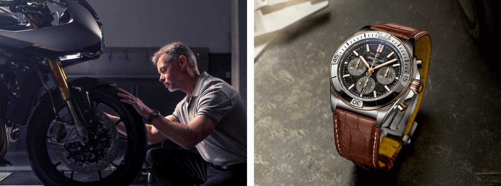 Esta obra-prima combina titânio e ouro vermelho de 18k com um mostrador antracite, inspirado no design do novo roadster moderno Speed Triple 1200 RR Breitling da Triumph.