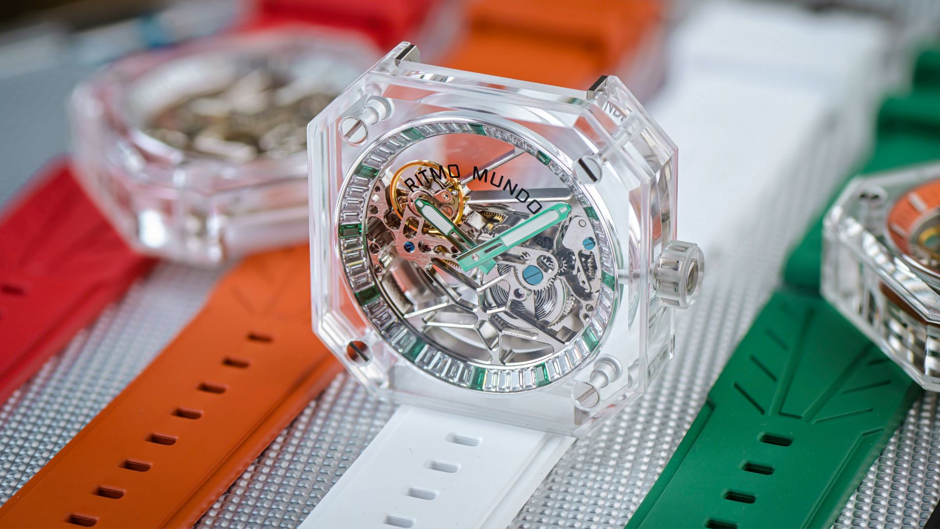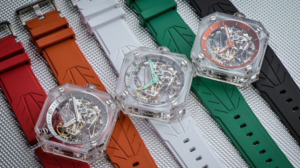 Com caixa de vidro de 44mm em forma de almofada, os novos modelos oferecem uma vista panorâmica de 360 graus do movimento esqueletizado do relógio e dos seus componentes. Alguns modelos também apresentam anéis de mostrador adornados com combinações de cristais coloridos e incolores – disponíveis em variações de cristais vermelhos e brancos, verdes e brancos, azuis e brancos, ou completamente incolor.