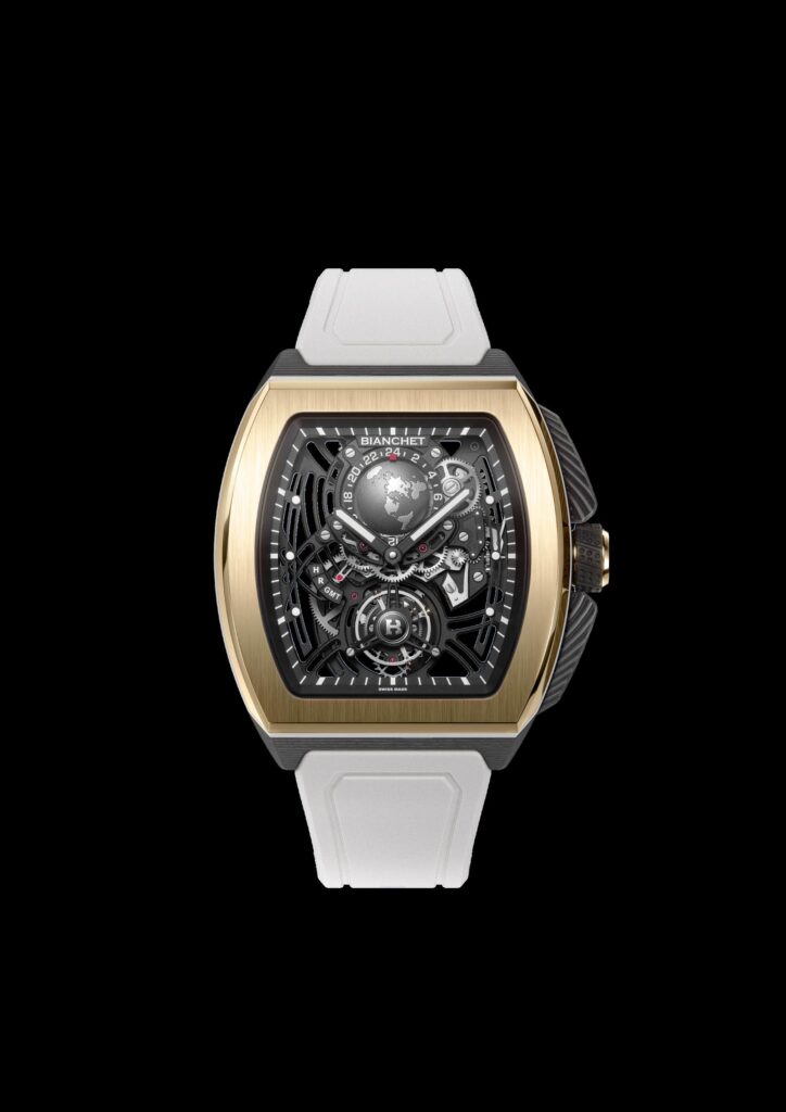 O Flying Tourbillon Sport GMT, lançado em março de 2024, é um testemunho da versatilidade e inovação de Bianchet. O seu destaque é a função GMT de dupla hora que mostra simultaneamente dois fusos horários. O mostrador GMT de 24 horas apresenta uma cúpula terrestre rotativa, uma referência ao facto de este relógio abraçar o globetrotter. Com um indicador de função coroa intuitivo, dar corda e acertar a hora local ou de referência é rápido e fácil. Tal como o seu antecessor, o Sport GMT também possui uma reserva de marcha de 90 horas, o que o torna um parceiro fiável para os aventureiros que se aventuram em novos territórios. Embora um aspeto moderno e desportivo defina a estética deste relógio, ele continua a ter as suas raízes na relojoaria tradicional suíça.