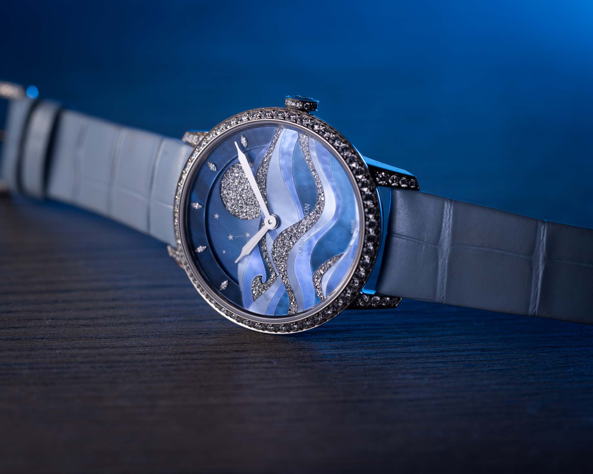 Esculpido de um bloco de ouro branco, o relógio é alojado numa caixa de 38 mm de diâmetro, 10,44 mm de espessura, resistente à água até 30 metros e adornada de 80 diamantes que, com os de lapidação brilhante na fivela e marquise no mostrador, somam 2,62 quilates. As ondas azuis e prateadas, a par da lua no céu de constelações pintadas à mão e da superfície em cristais de ruténio, acrescentam preciosidade e textura.