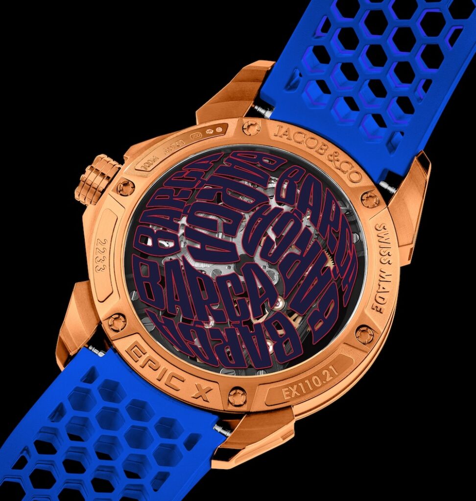 O relógio de 44mm requer um movimento que traga toda a energia do Epic X e do FC Barcelona. O Calibre JCAM46 é um movimento esqueleto de turbilhão inteiramente dedicado à celebração do 125º aniversário da equipa. A caixa de ouro rosa é projetada para proteger cada parte saliente. A coroa é protegida por ombros e um anel de borracha vermelha. Essa robustez é ainda mais reforçada pela resistência à água da caixa até 100 metros.