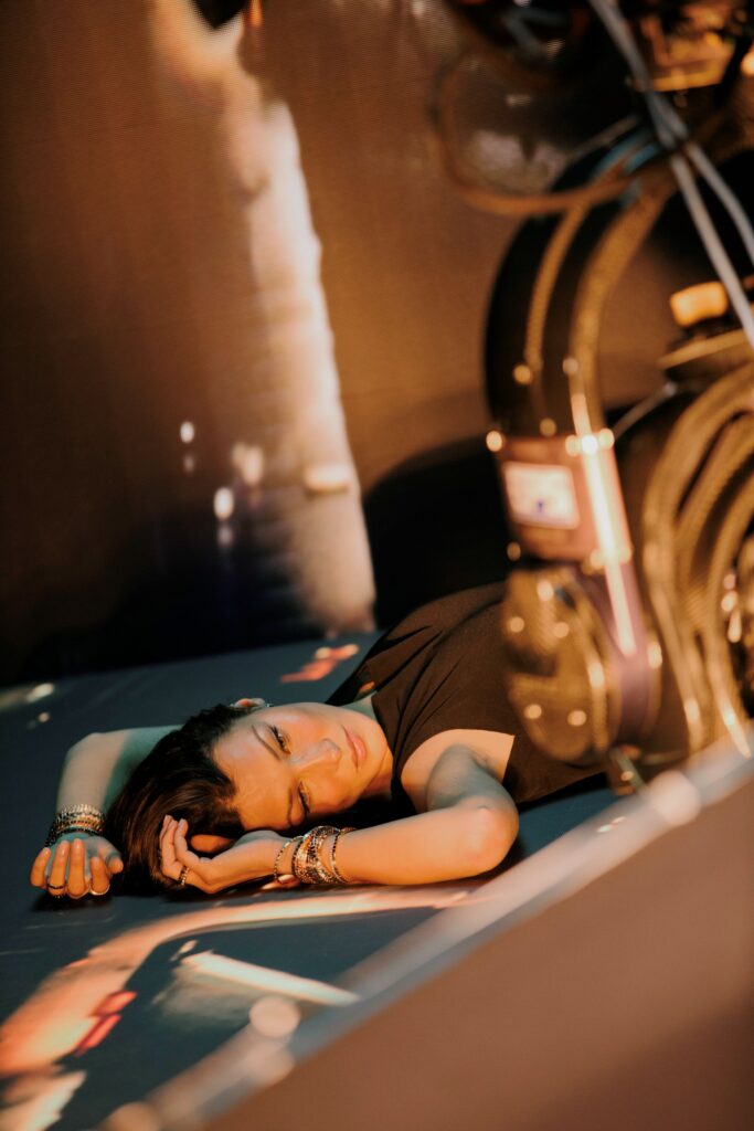 Esta coleção cápsula Ice Cube é fabricada em ouro rosa ético de 18 quilates, que, realçado por um polimento espelhado executado perfeitamente, dialoga constantemente com a luz. Como a luz do sol refletida nos arranha-céus transformados em espelhos, os reflexos rosados do ouro, combinados com as alturas variadas dos cubos e o brilho dos diamantes, evocam ainda mais a referência a um horizonte de metrópole durante a hora de ouro.