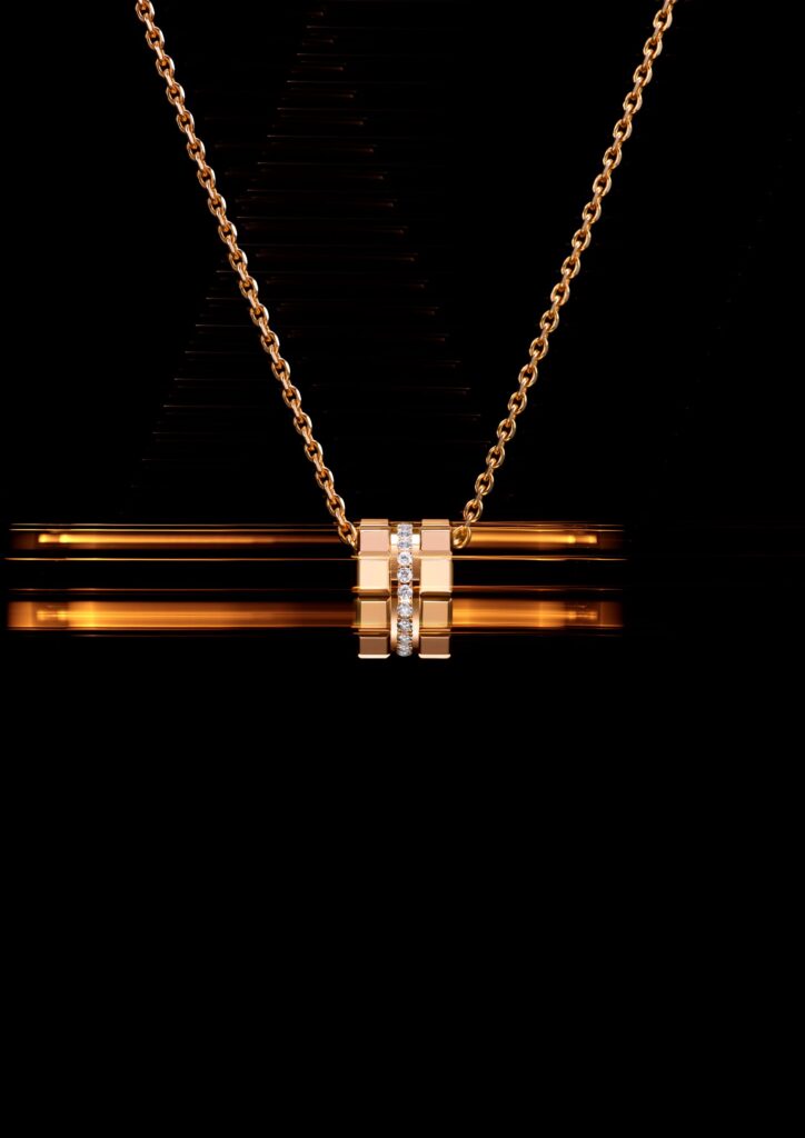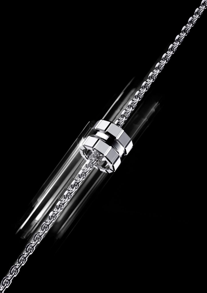 Cada cubo é sutilmente facetado em cada uma de suas bordas perfeitamente simétricas. Dentro destas microsuperfícies, a luz encontra inúmeros pontos de refração, amplificando o brilho da joalharia. O polimento do espelho é então finalizado com uma almofada, proporcionando a cada criação o seu brilho e brilho supremos numa celebração perpétua das habilidades artesanais.