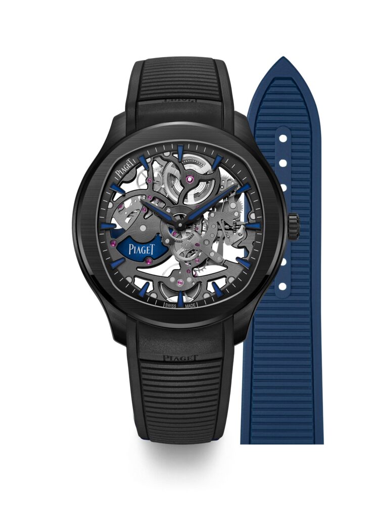Alimentado pelo calibre automático ultrafino Manufacture 1200S1, a estética preta do relógio é contrastada por impressionantes detalhes em Superluminova: nos índices e ponteiros, e agora pela primeira vez, o logotipo da Piaget no peso oscilante. Isto traz um dinamismo único ao design, complementado pela versatilidade adicional do sistema de pulseira intercambiável SingleTouch, introduzido pela primeira vez no Piaget Polo Perpetual Calendar Ultra-Thin preto em 2023. O relógio pode ser equipado com uma pulseira de borracha preta com uma pulseira dobrável de aço e titânio ou uma pulseira de borracha azul adicional.