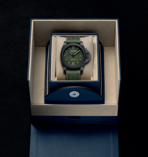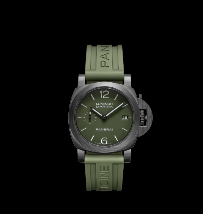 Para uma versatilidade de 360º, o Luminor Quaranta Carbotech™ PAM01526 apresenta o inovador sistema PAM Click Release nas suas braceletes – uma bracelete primária em borracha verde militar e uma secundária em pele, em homenagem aos designs da Panerai da década de 1960.