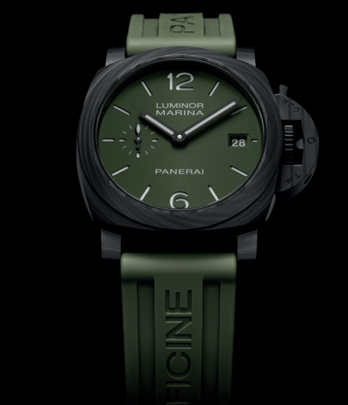 Pela primeira vez, o Luminor Quaranta apresentará uma caixa Carbotech™, um material conhecido pela sua natureza leve e robusta, fabricado a partir de fibras de carbono. O processo de fabrico do Carbotech™ envolve a compressão de folhas de fibra de carbono a uma temperatura precisa e alta, juntamente com PEEK (Poliéter Éter Cetona), um polímero técnico que liga o compósito, aumentando a sua resistência e longevidade. As placas Carbotech™ resultantes apresentam propriedades mecânicas e desempenho superiores em termos de relação resistência/peso, permitindo uma ergonomia muito confortável e sendo resistentes a condições de desgaste difíceis. Excelente resistência a forças externas e à corrosão, o Carbotech™ é 80% mais leve do que o aço, 73% mais leve do que a cerâmica e 64% mais leve do que o titânio. A superfície preta mate irregular, que varia em função do corte do material, confere a cada relógio um aspeto ligeiramente diferente, dando a cada peça um carácter único.