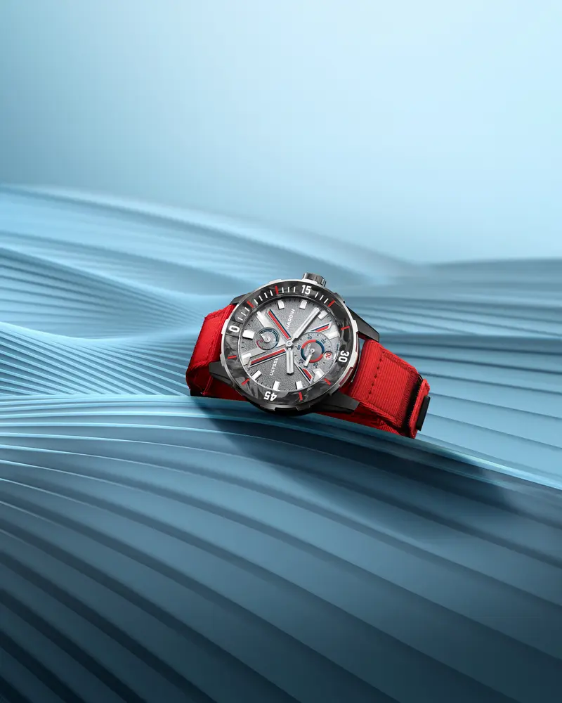 Este relógio inovador contém um catálogo incrível de materiais reciclados, incluindo aço reciclado, fibra de carbono reciclada e redes de pesca recicladas. Ainda mais inovador, o escape do movimento é produzido a partir de silício reciclado.